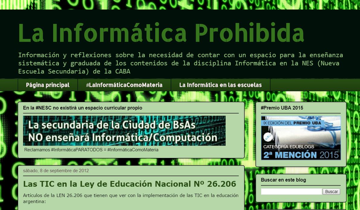 Así fue que el 8 de septiembre de 2012 publiqué la primera entrada del blog «La Informática Prohibida», con fragmentos de la Ley de Educación Nacional Nº 26.206, destacando Títulos, Capítulos y Artículos que hacen referencia a la importancia de impulsar la enseñanza de las TIC en la educación argentina.